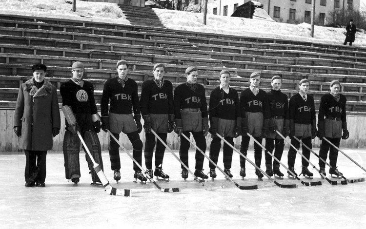 TBK-miehistö, joka varmisti SM-sarjapaikkansa vasta uusintaottelussa Karhu-Kissoja vastaan kaudella 1944-45. Kuvassa vasemmalta Harry Lindblad, maalivahti Gösta Wangel, Jarl Ohlson, Rolf Alander, Olli Solja, Erik Hedman, Jaakko Hietaniemi, Paavo Solja, Nils Nummelin ja Alfred Ekholm.