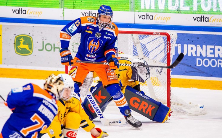 Kaksimetrinen ja satakiloinen hyökkääjä Lassi Vanhatalo pystyi viimeinkin vakiinnuttamaan paikan Liigassa kaudella 2020-21. Hän teki sen maalineduspelaamisella, maskien tekemisellä, ohjauksilla ja reboundeihin iskemällä. Maaleja syntyi runkosarjassa kaikkiaan kahdeksan ja toinen mokoma auttamalla joukkuekaveria osumaan pimittämällä maalivahdin näkökentän. Kuvassa Jukurien maalivahti Sami Rajaniemi yrittää turhaan nähdä, mistä ja koska Kristian Kuusela ampuu.