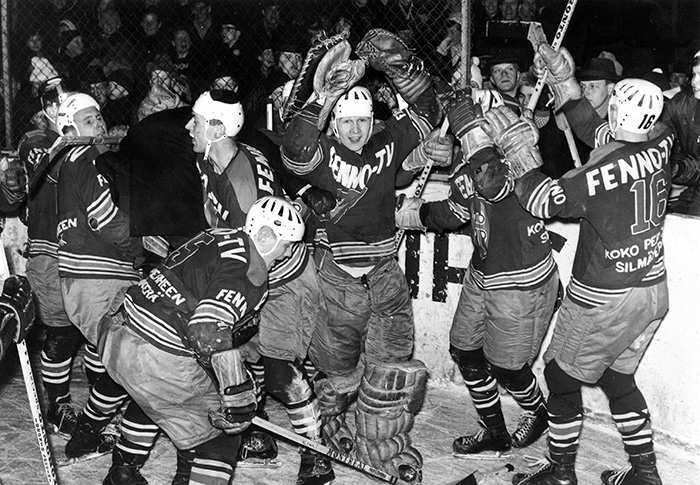 Mestaruus on ratkennut kirvesrinnoille vuonna 1964. Kameraan päin tuulettelee näkyvimmin maalivahti Matti Peltonen. Happamat ilmeet katsomossa kuuluvat mestaruusottelun hävinneen TK-V:n kannattajille.