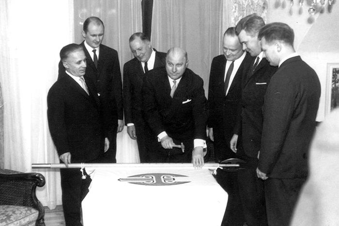 Tappara sai oman lippunsa vuonna 1963. Kuten näkyy, sellainen tehtiin harvoin nähdystä seuralogon kilvettömästä versiosta. Vasara kädessä lippua keppiin naulaamassa on Per-Olof Hagberg, joka oli paikalla jo vuonna 1932 TBK:n perustajajäsenenä. Muut kuvassa ovat vasemmalta Mikko Westerberg, Esko Luostarinen, Harry Lindblad, Juhani Saraste ja Jarl Ohlson.
