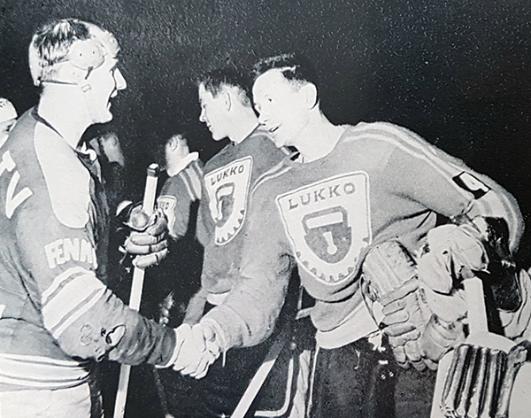 Rauman Lukko onnistui kaatamaan Tapparan ratkaisuottelussa vuonna 1963 ja otti samalla ensimmäisen Suomen mestaruutensa, joka pysyi seuran ainoana lähes 60 vuotta. Esko Luostarisen ei auta muuta kuin onnitella raumalaisten Teppo Rastiota.
