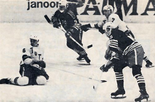 Jorma Oksala (etuoikealla) ja Antti Alenius (9) mylläävät TuTo-puolustusta polvilleen. Kannattaa huomata taka-alalla myös varsin nykyaikainen mailalla tapahtuva kiekottoman pelaajan kahvaaminen. Kuva on vuodelta 1966.