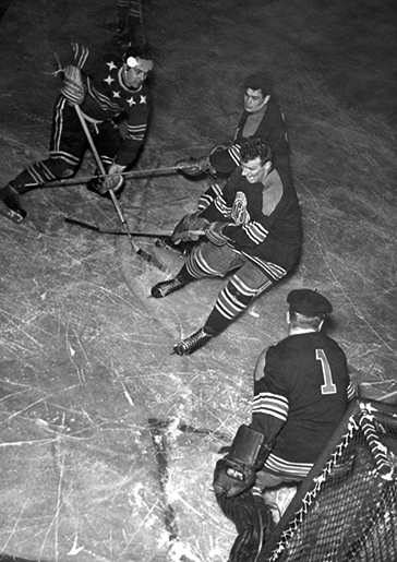 HIFK hyökkää kohti TBK:n maalia vuonna 1954. Ei tamperelaisilla silti isompaa hätää ole, kun pakkipari Matti Lampainen – Ossi Kauppi siivoaa Niemen Eskon edessä. TBK voittikin pelin lopulta 9-1.
