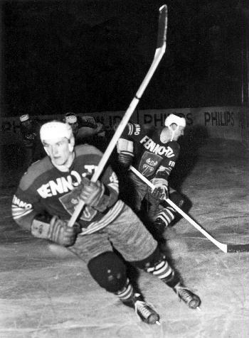 Tappara kääntää tilannetta puolustuksesta hyökkäykseksi 1960-luvun alussa. Kallu Numminen poimii kiekon takana, ja ilmeisesti Heikki Koskimies ottaa jo volttilähtöä kaarreluisteluun.