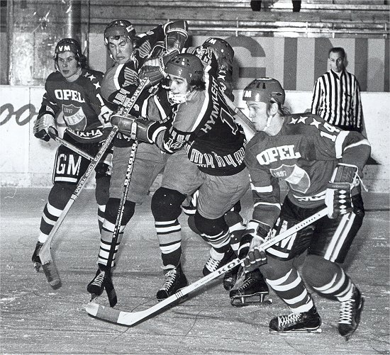 Tapparan ja HIFK:n välillä väännettiin tiukasti myös 1970-luvun puolivälissä. Kirvesrinnoista Mikko Leinonen (14) ja Pekka Mäkinen pyrkivät irti ruuhkasta ja kiekon perään.