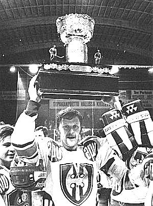 Tapparan 70-luvun lopun puolustaja Jorma Kallio nostelee Kanada-maljaa keväällä 1979. Jommu ehti maistaa mestaruuden makua jo paikalliskilpailija Ilveksenkin paidassa ennen tuloaan Rauman kautta Tapparaan. Myöhemmin hän toimi mm. Tapparan A-nuorten valmentajana.