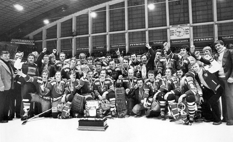 Tappara juhlii mestaruutta Hakametsässä 24. maaliskuuta 1977, kun TPS on kaatunut kolmannen kerran murskaavasti 9-1. Mestaruus oli ylivoimaisin liigahistoriassa: välierissä Tappara kaatoi KooVeen kolmesti (11-0, 6-1, 11-3) ja finaaleissa TPS sai lähes samat kyydit (7-2, 4-2, 9-1). Runkosarjassakin kirvesrintojen maalikeskiarvo ottelua kohti oli ollut kuusi osumaa.