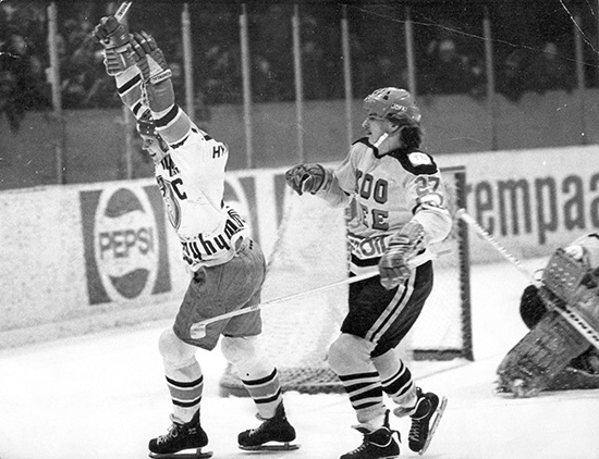 ”Mussu” Ansakorpi on iskenyt yhden uransa 156 pääsarjamaalista. Tällä kertaa tuuletetaan KooVeen verkkoon iskettyä osumaa joskus vuoden 1974 tietämissä.