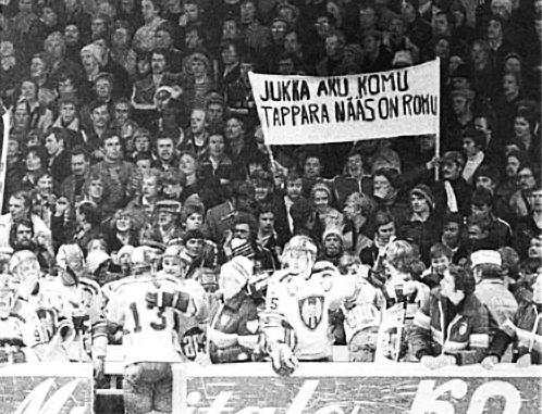 Tapparan tehoketju saa riimikästä kannustusta ison sylivälin omaavalta katsojalta Porissa vuonna 1979. Antero Lehtonen (13) ottaa onnitteluja vastaan Jari Lindgreniltä. Jukka Alkulaa (9) koko homma naurattaa kuvan vasemmassa reunassa. Komu Koivulahti taas näyttää käsi suun edessä paljon hämmästyneemmältä. Juha Silvennoinen (15) miettii pitäisikö jäälle mennä vai ei. Rauno Korpi on varustautunut katsomosta huokuvaa kylmää vastaan kunnon pipolla, mutta Kallu Numminen vetää ihan toppatakki auki.