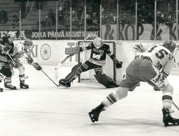 Kyllä ne maalivahtien varusteet vähän kapoisemmilta näyttivät ennen vanhaan. Tässä 80-luvun taitteen kuvassa Juha Silvennoinen (15) on pistänyt nappisyötön takatolpalle, jossa Oiva Oijennus ohjaa kiekon ohi veskarin.