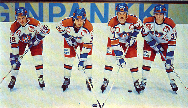 Tapparan puolustuskalustoa kaudella 1977-78. Vasemmalta lukien Jukka Hirsimäki, Pekka Marjamäki, Pekka Mäkinen ja Rauno Saarnio. Hirsimäki toimi myöhemmin näkyvässä roolissa SM-liigan kurinpitolautakunnassa. Marjamäki nähtiin Tapparan kakkosvalmentajanakin.
