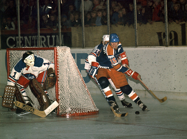 Syyskuussa 1975 Tappara otti mittaa kahdesta ammattilaisliiga World Hockey Associationissa (WHA) pelanneesta seurasta. Niistä toinen, Winnipeg Jets, siirtyi myöhemmin NHL:ään, kun WHA:n taru tuli loppuun. Tappara veti tasapelit sekä Jetsiä että toista WHA-joukkuetta Toronto Torosia vastaan. Kuvassa kirvesrintojen Juha Silvennoinen kiertää Joe Daleyn vartioimaa Jets-maalia ottelussa, joka päättyi 3-3.
