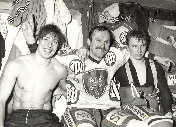 Hannu ”Häpä” Oksanen oli voittanut Suomen mestaruudet kaikissa juniori-ikäluokissa mutta miesten SM-liigan mestaruus oli osannut kiertää miestä pitkään – kunnes hän tajusi 1980-luvun puolivälissä hankkiutua pelaamaan Tapparaan. Mestaruusketjun puuttuva osa täydennettiin jo ensimmäisen kirvesrintakauden päätteeksi keväällä 1986. Tässä Häpä juhlii puuttuneen linkin löytymistä kainaloissaan paidaton Pauke Järvinen ja henskelimies Tomppa Pohja.
