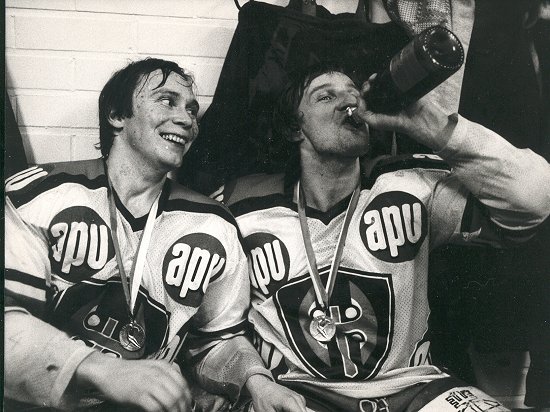 Hannu Helander ja Pertti Valkeapää ottavat urheilujuomaa erätauolla? Ei sentään, vaan kyseessä on mestaruusjuhlintaa keväällä 1982. ”Pedro” ottaa pitkää huikkaa ja ”Kustaan” ilmeestä voi päätellä, että maistuisi varmaan hänellekin. Ennen uransa loppumista Valkeapää voitti vielä kaksi mestaruutta vuosina 1984 ja 1986, kun taas Helander voitti mestaruuden noiden vuosien välissä 1985 siirryttyään takaisin Ilvekseen.