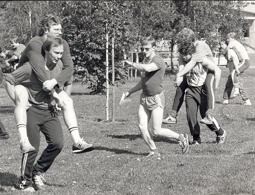 Tappara kesätreenaa 80-luvun alussa. Valmentaja Rauno Korvelle ei ole riittänyt partneria reppuselkäleikkiin, mutta Rane hyppelehtii hilpeänä yksikseenkin. Vasemmalla lähimpänä kuvaa kirmaa Ilves-lähtöinen kaksikko, jossa Hannu Helander kantaa keväällä 2004 Ässien toimitusjohtajaksi siirtynyttä Jukka Hirsimäkeä. Vesa Launis seuraa selkäreppunsa kanssa Ranea kuin hai laivaa.