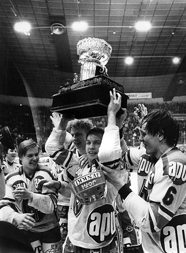Kapteeni Pertti Koivulahti nostelee Kanada-maljaa Hakametsässä vuoden 1982 mestaruuden jälkeen. Myöhemmin kapteeniksi nouseva Lasse Litma haluaa oikealla jo kannua käsiinsä. Vielä myöhemmin kapteenin C:n paitaansa saanut Timo Jutila naureskelee vasemmassa reunassa. Kanada-maljan alla Komun käsien välissä näkyy Juha Nurmi.