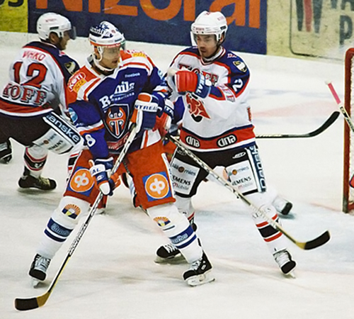 Isokokoinen Marko Mäkinen haki läpimurtoaan SM-liigaan monessa joukkueessa ja vihdoin se onnistui Tapparassa kaudella 2000-01. Tässä ”Mako” on parkkeerannut HIFK-maalille lokakuussa 2001 ja isoa miestä ei siitä niin vaan siirretäkään sivuun.
