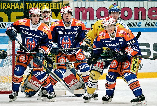 Kyseessä on Tapparan ja Lukon välinen matsi, mutta ruuhkaa on silti kuin KooVeen maalilla. Marko Kauppinen (6), Janne Ojanen ja Sami Venäläinen (38) pyrkivät peittämään maalivahti Scott Langkow’n näkyväisyyttä Lukko-pakin toivoessa pidempää mailaa, jolla saisi kaikki kolme vihulaista kerralla samaan vartaaseen. Enää ei puutu kuin kiekon mentävä aukko. Kuva on kaudelta 2005-06.