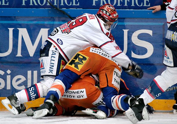 Tappara-pelaajista ei näy kuin takamukset, kun HIFK:n Arttu Luttinen on pistänyt miehet mailallaan poikki ja pinoon joulukuussa 2005.