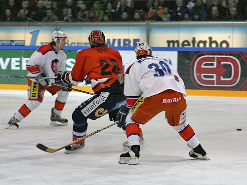 Kaudella 2004-05 juhlittiin SM-liigan 30-vuotista taivalta ja sen kunniaksi välillä pelattiin takavuosikymmenten peliasuja jäljittelevissä paidoissa. Tässä Tapparan valkoista malli-76:tta esittelevät Ville Nieminen ja Pekka Saravo. HPK:n oranssin mannekiinina toimii Jani Rita.