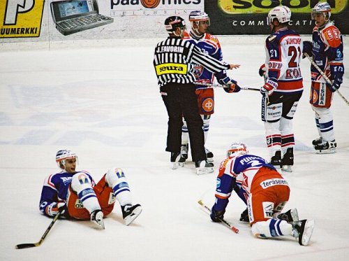 Jaakko Uhlbäck (40) ja Pasi Puistola (21) ottavat rennosti kesken pelin. Esa Pirnes (10), Johannes Alanen ja HIFK:n Jonni Vauhkonen vaikuttavat paljon kiihkeämmiltä neuvotellessaan linjatuomarin kanssa.