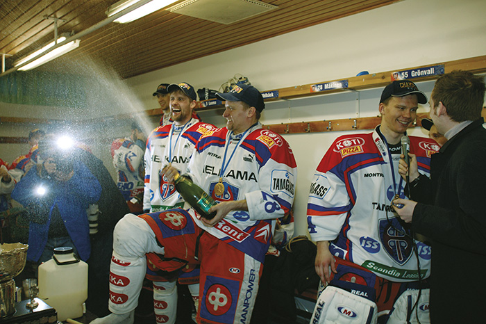 Mestaruus maistui Tapparalle viidentoista vuoden tauon jälkeen keväällä 2003. Oulun pukukopissa samppanjaa ruiskivat Marko Mäkinen (28) ja Janne Grönvall. Maalivahti Mika Lehto kertoo tuoreita tunnelmia MTV:n Jani Uotilalle.