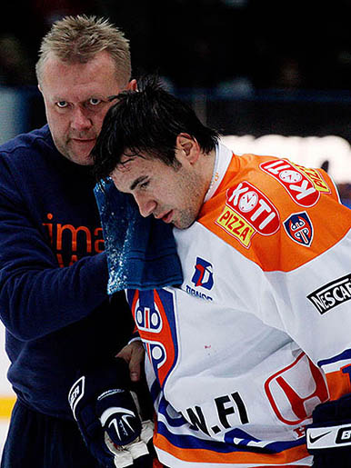 Vain noin 170-senttinen amerikkalaishyökkääjä Steve Saviano oli yksi kauden 2007-08 väriläiskistä. Tehopisteitä ei aina tahtonut tulla, mutta vikkelän väkkärän pyöritykset viihdyttivät silti. Playoffeissa Saviano oli Tapparan paras maalintekijä viidellä osumallaan. Kuvassa Tapparan hieroja Vellu Pohjonen paikkailee Steven korvaa, johon osui Teemu Aallon siniviivapommi.
