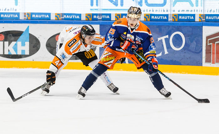 Kuvassa Haapalaa ahdistelee KooKoon Mikko Lehtonen, joka seuraavaksi kaudeksi siirtyi Tapparaan.