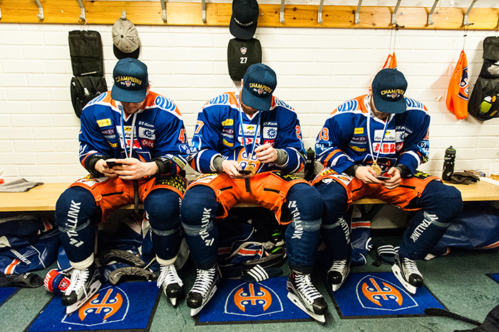 Tässä kenties ihan osuvakin ajankuva 2010-luvusta. Tappara on vähän aiemmin sinetöinyt Kuopiossa Suomen mestaruuden 2017 ja poistunut jäältä pukukoppijuhliin. Mutta juhlinnan keskellä pitää myös päivittää tuntemukset somekanaviin ja läheisille! Norjalaiset Alexander Bonsaksen ja Martin Røymark sekä Kemiläinen Valtteri näyttävät mallia.
