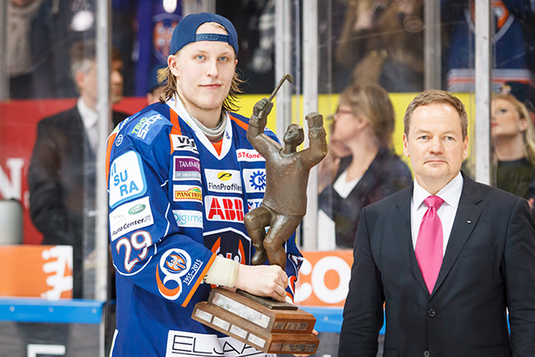 Patrik Laine pokkasi superkaudellaan 2015-16 Jari Kurri -palkinnon pudotuspelien arvokkaimpana pelaajana. 18-vuotiaana hän on kaikkien aikojen nuorin tämän huippukunnian saanut pelaaja. Laine palkittiin kauden jälkeen myös Jarmo Wasaman muistopalkinnolla Liigan vuoden tulokkaana. Kuvassa Laineelle playoff-palkintoa jakamassa Liigan puheenjohtaja Vesa Puttonen.