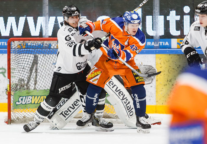 Otto Rauhala otti ison askeleen eteenpäin tehopisteissäkin kolmannella liigakaudellaan tehden 6+11=17. Kuvassa Rauhala esittelee Tapparan erilaista oranssia erikoispaitaa, jolla pelattiin yksi erä Suomi100-juhlaottelussa TPS:ää vastaan tammikuussa 2017. Oton kanssa vääntämässä turkulaisten Jani Forsström.