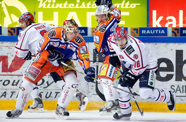 Kauden 2011-12 Tapparan paras pistemies oli kuvan kultakypäräinen Jussi Makkonen, joka teki 7+26=33 tehopistettä. Kuvan toinen Tappara-pelaaja Antti Erkinjuntti puolestaan oli yhdessä Jerry Ahtolan kanssa joukkueen paras maalintekijä 14 osumalla. Sekä Makkonen että Erkinjuntti olivat tulleet edelliskauden jälkeen Tapparaan TPS:stä. Kuvassa he taistelevat HIFK:n Ville Peltosta ja Mikko Kousaa vastaan.