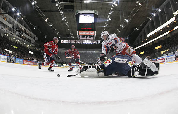 Tältä se näyttää maalin sisältä katsottuna, kun Olli Palola kiertää HIFK:n Joni Ortiota pistääkseen kiekon tyhjään häkkiin puolivälierissä 2013. Tällä kertaa ei muuten onnistunut, vaan Ortio esti maalin kamppaamalla tilanteesta itselleen jäähyn.