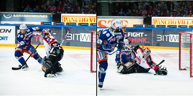 Toisessa jatkoerässä kirvesrintojen Dragan Umicevic – joka oli siirtynyt Tapparaan kesken kauden Ässistä – pääsi nokikkain porilaisvahti Antti Raannan kanssa kuvien osoittamalla tavalla. Laukaisu jäi kuitenkin turhan heppoiseksi yritykseksi jostain selän takaa ja Raanta onnistui pysäyttämään kiekon ranteellaan. Seuraavassa jatkoerässä Ässät teki maalin ja sai sarjan katkolle omaan kotihalliinsa.