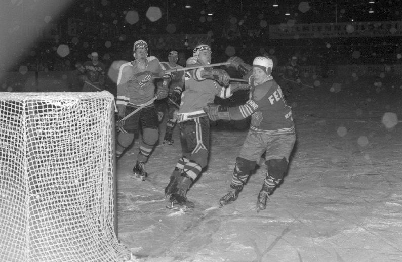 Töölön Vesa pelasi jääkiekkoa SM-sarjassakin ennen kuin siitä 1960-luvun loppupuolella tehtiin Helsingin Jokerit. Hiukan vajaa puoli vuosisataa sen jälkeen Jokerit jätti koko Suomen kaukalot ja siirtyi pelaamaan KHL-liigaa lähinnä venäläisiä joukkueita vastaan. Kuvassa Tapparan Mikko Holopainen aiheuttaa ongelmia Vesan puolustukselle Koulukadulla maaliskuussa 1963. Ongelmia riitti lopulta Tapparan 9-2 -voittonumeroiden edestä.