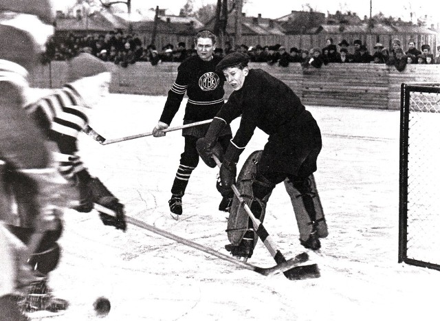Helmikuussa 1949 TBK ja Ilves kävivät esittelemässä jääkiekkoa Porissa, jossa siinä vaiheessa ei vielä ollut kunnollista organisoitua joukkuetoimintaa. Näytösottelussa iskettiin maaleja oikein olan takaa, ja lopulta sinipaitaiset voittivat keltamustapaitaiset maalein 10-8. Kuvassa TBK-junioreiden veskari Lasse Helin siivoaa kiekkoa pois maalinsa lähettyviltä. Toisen näkyvän TBK-pelaajan nimi ei ole tiedossa.