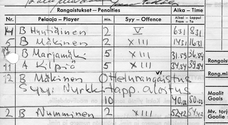 – Väärä pelaaja sai jäähyn, protestoi valmentaja Ohlson Jääkiekkoliittoon ja nimesi oikeaksi syylliseksi joukkueensa toisen pelaajan Juhani Peltolan. – Lisäksi Peltolan rike oli mitätön, korkeintaan kahden minuutin arvoinen.