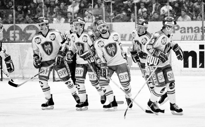 Tappara-viisikko palaa kohti vaihtopenkkiä vakavin naamoin finaalipelissä vuona 1986. Hihoissa on mustat surunauhat juuri ennen finaalien alkua autokolarissa kuolleen huoltaja ”Pappa” Paavolan takia. Jäällä vasemmalta Teppo Numminen, Kari Heikkinen, Pertti Valkeapää, Jorma Sevón ja Tommi Pohja.