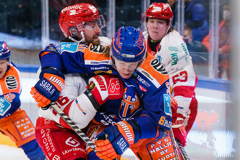 Saku Salmisella on ahdasta Vaasan Sportin Shaun Heshkan puristuksessa. Tiukkaa oli Salmisella myös löytää vakioroolia Tapparan kovassa puolustusmiehistössä, mutta hommat hoituivat niin seitsemännen pakin kuin tarvittaessa nelosketjun laitahyökkääjänkin roolissa ja kokemusta kertyi runkosarjan aikana 42 ottelussa.