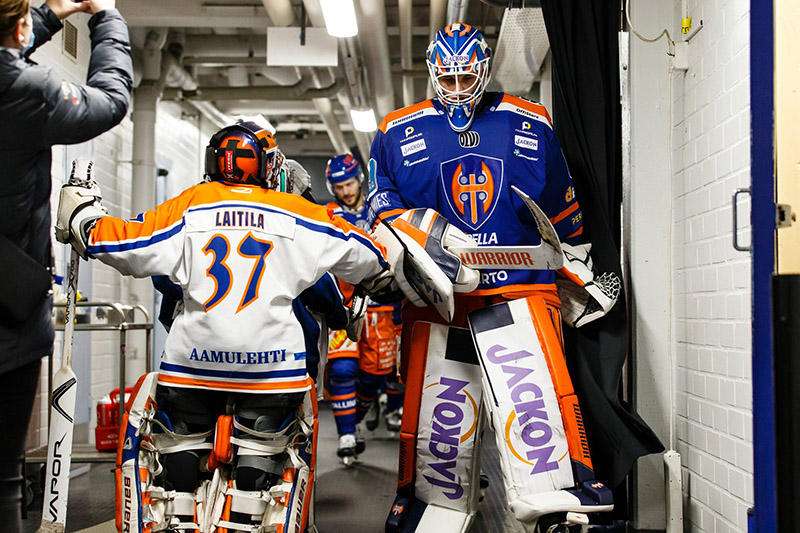 Liigaottelun erätauolla torjuntataitojaan esittelemään päässyt juniorimaalivahti ottaa läpsystä vaihdon kolmanteen erään torjumaan tulevalle Kari Piiroiselle Hakametsän pukukoppikäytävällä syksyllä 2021.