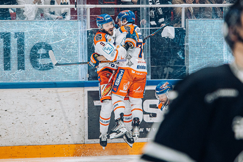Charles Bertrandin peliaika oli kortilla keväällä 2022, mutta ranskalainen onnistui silti iskemään yhden kauden tärkeimmistä Tappara-maaleista. Turussa pelattu toinen finaaliottelu eteni tasatilanteessa jatkoerään, jota ehti kulua kaksi minuuttia ja 41 sekuntia ennen kuin kiekko löytyi TPS-verkosta, kun Bertrandin syöttöyritys oli onnekkaasti kimmonnut TPS-pelaajan jalan kautta maaliin. Tappara siirtyi finaalisarjassa johtoon voitoin 2-0. Kuvassa Bertrandin syliin on hypännyt Kristian Kuusela.
