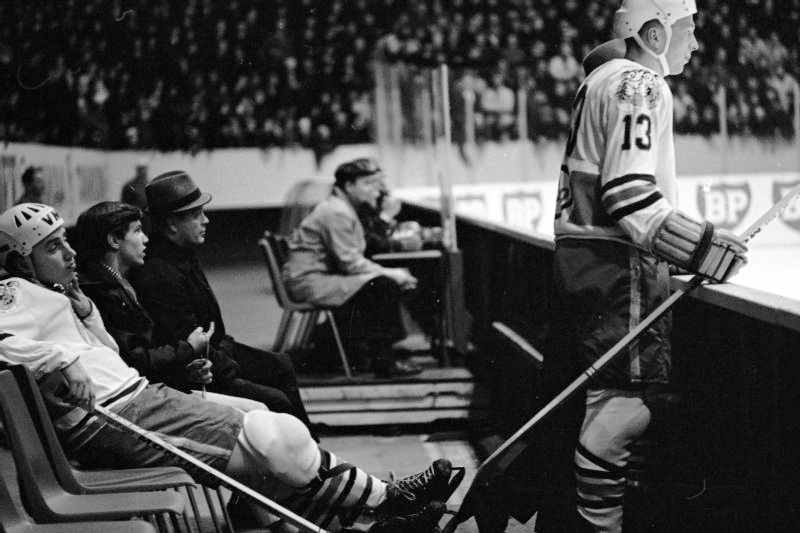 Esa ”Villen isä” Nieminen ottaa rennosti jäähyaitiossa marraskuisessa ottelussa Ilvestä vastaan vuonna 1967. Kari Sillanpää puolestaan on valmiina hyppäämään jäälle, sillä hänen jäähynsä on juuri päättymässä.