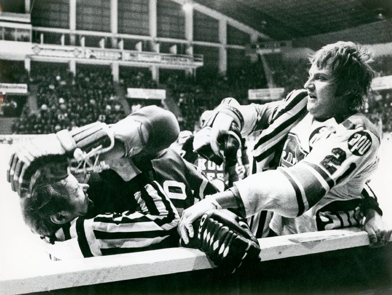 Martti Jarkko ja KooVeen Reima Pullinen ottavat viisiminuuttiset keskinäisestä nahistelusta joulukuussa 1978. Vitosensa istuttuaan Jarkko palasi kentälle ja ratkaisi kahdella maalillaan kirvesrinnoille voiton 5-2.