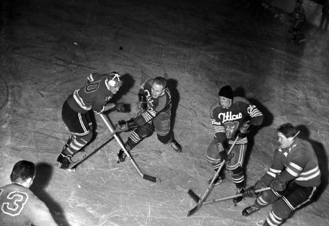 Ilman päähinettä pelaava Erkki Hytönen laukoo kohti Kokkolan Hermeksen maalivahtia Lauri Mattssonia. Pipopäinen Jouni Seistamo seuraa mahdollista irtokiekkoa. Tappara voitti maaliskuussa 1960 pelatun ottelun 7-2.