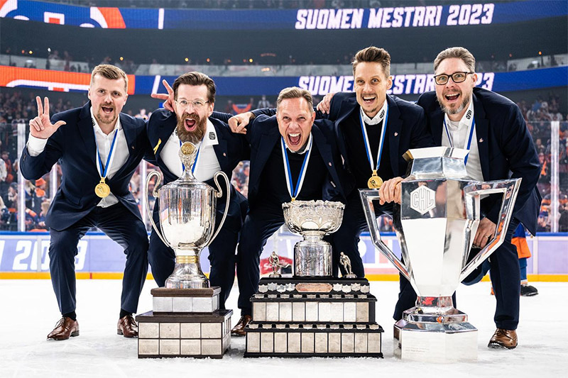 Kuvassa viisi valmentajaa ja kolme voittopokaalia, joita nämä valmentajat olivat Tapparalle tuomassa. Valmennusviisikko vasemmalta lukien Konsta Karjalainen, Aki Näykki, Jussi Tapola, Pasi Puistola ja Tuomas Tuokkola. Valmennusryhmäkuvasta puuttuu fysiikkavalmentaja Tommi Pärmäkoski. Pokaalit vasemmalta lukien ovat Liigan runkosarjan voittajan saama Harry Lindbladin muistopalkinto, Kanada-malja ja Champions Hockey Leaguen mestaruuspokaali.