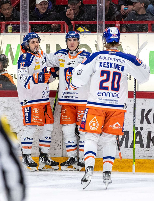 Kuvassa Puhakka on iskenyt maalin ja ketjukaverit Halloran (17) ja Keskinen onnittelevat.