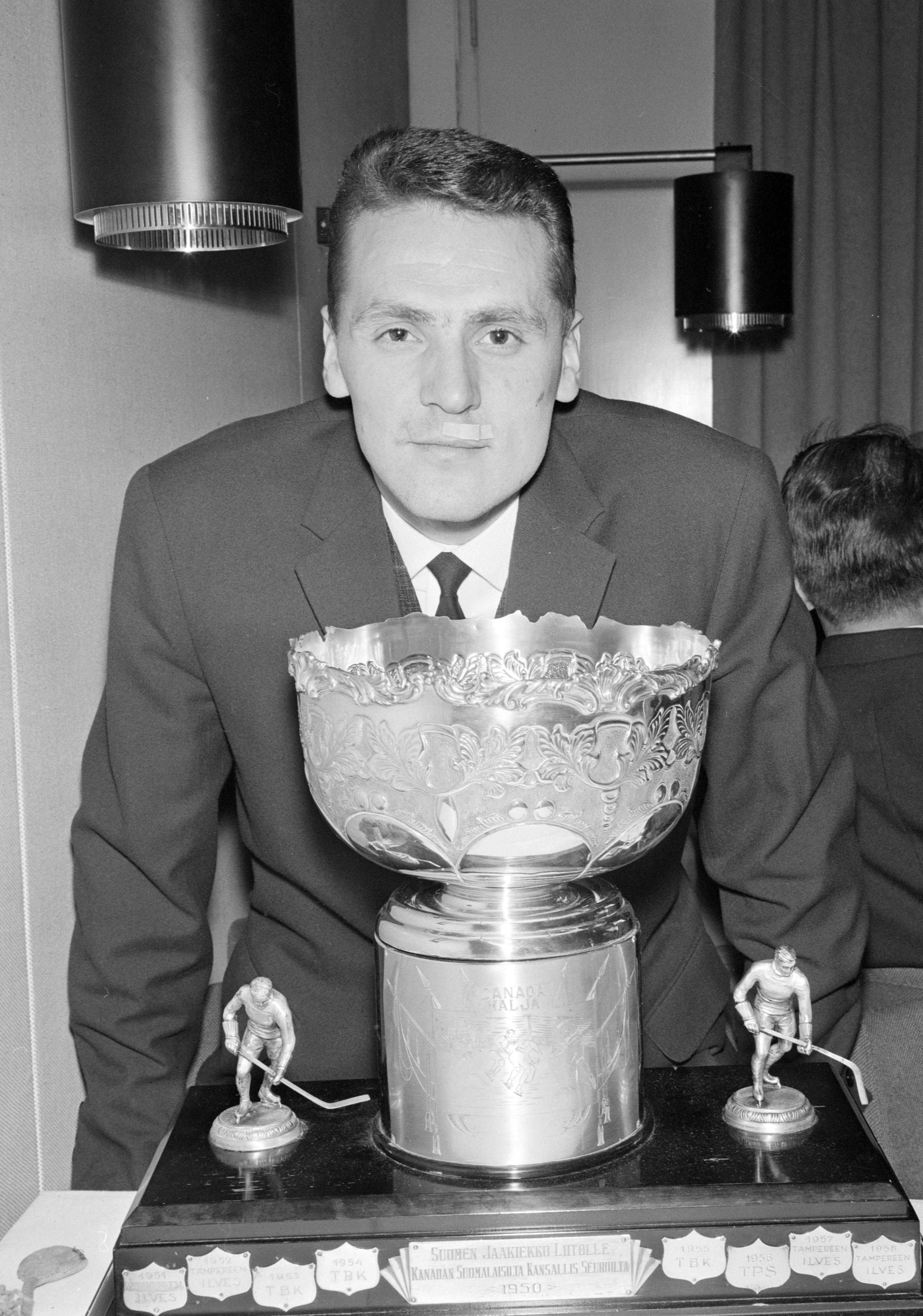 Kalevi Numminen on kuvassa kolmatta ja viimeistä kertaa mestarina Kanada Maljan kanssa vuonna 1964. Myöhemmin valmennusurallaan hän pääsi kohottelemaan pokaalia vielä toiset kolme kertaa.