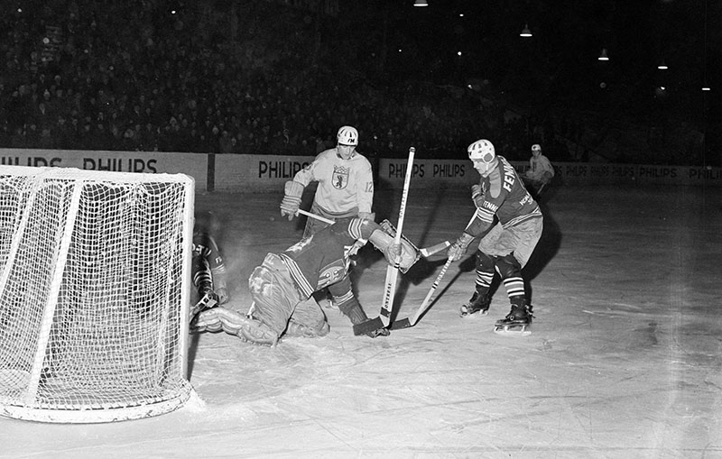 Porin Karhut on vierailulla Koulukadulla helmikuussa 1964 kaupunkinsa vaakunan kuva rinnassaan. Matti Peltonen sulkee kiekon jäätä vasten ja ottaa pelikatkon puolustaja Kari Mäkisen varmistaessa.