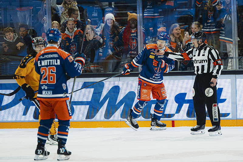 Kaudella 2025-26 Tapparassa pelasi peräti kolme veljesparia. Yhtenä niistä kaukalossa nähtiin Mattilan kaksoisveljekset Jesper ja Julius. Kuvassa juuri maalin SaiPan verkkoon tehnyt Julius oli liittynyt kirvesrintoihin jo edellisellä kaudella, ja vuotta myöhemmin puolustajan paikalla pelaava velipoika Jesper (26) seurasi perässä. Juliuksen pelinumero muuten oli käänteisesti 62.