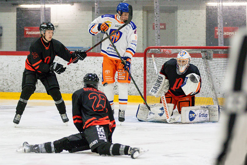 Kuvassa Oliver Suvanto tekee maskia maalivahti Faustas Nausédalle, joka oli kyseisellä kaudella Tapparan kolmosvahti ja sai laatupeliaikaa Pyryn Mestis-peleissä. Tapparan maalivahtina muuten tässä harjoituspelissä torjui U20-joukkueen William Gammals. Kuvassa olevat muut Pyry-pelaajat ovat Atte Lehikoinen (25) ja Miro Ahvenlampi (27), jotka olivat joukkuetovereita jo muutamaa vuotta aiemmin nimenomaan Tapparan junioreissa!